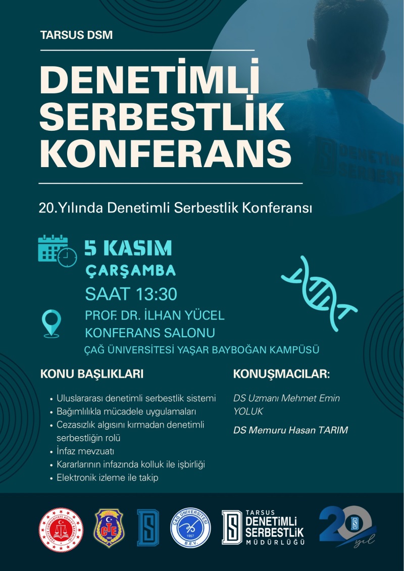 Konferans,Çağ üniversitesi, hukuk fakültesi öğrencilerine denetimli serbestlik sisteminin güncel gelişmeleri ve yenilikçi uygulamaları, alanında uzman isimler tarafından ele alınacak. İngiltere’deki probation sistemi gibi uluslararası örnekler anlatılarak sistemin, adalet ve rehabilitasyon alanındaki katkıları konuşulacaktır.